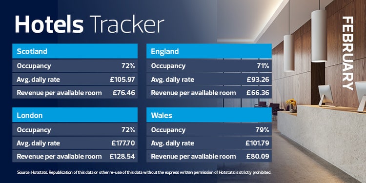 The data, which is compiled and produced by Hotstats and analysed by RSM UK, shows occupancy of UK hotels was relatively flat, rising from 71.7% to 71.9% in February year-on-year, but was down slightly in London from 72.9% to 72.3%.