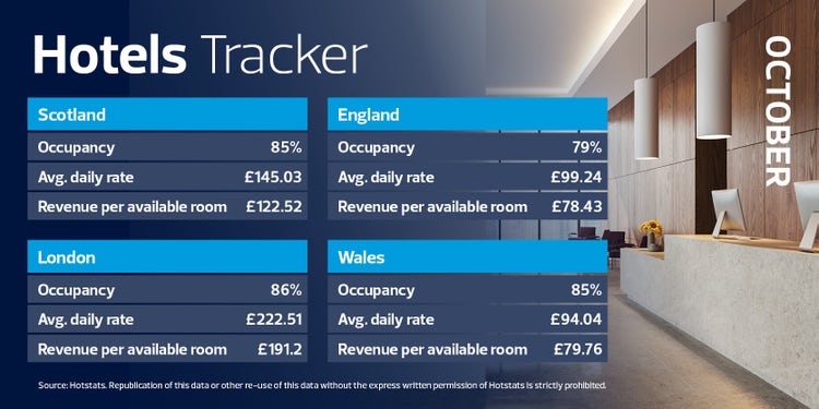 Average daily rates (ADR) of occupied rooms also increased in the UK from £151.81 to £155.03 in October year-on-year and was up from £217.80 to £222.64 in London.