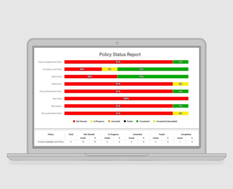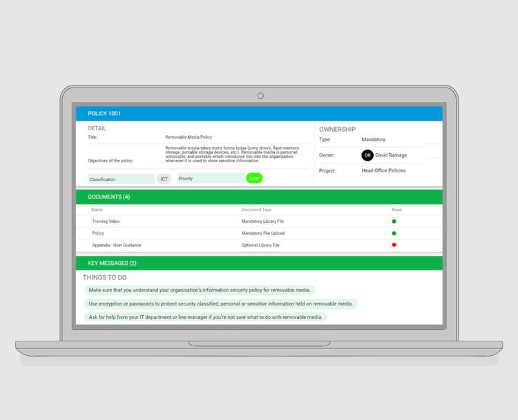 4policies™ enables you to educate your employees on your company policies and procedures, identify levels of awareness and record their acceptance of these policies. In addition, 4policies™ can be used to demonstrate compliance with employer obligations under various regulations and legislation. Your policies (for example, covering confidentially, safeguarding, financial crime etc.) can easily be displayed to your employees and their understanding of them monitored through the extensive reporting facilities built into the software.